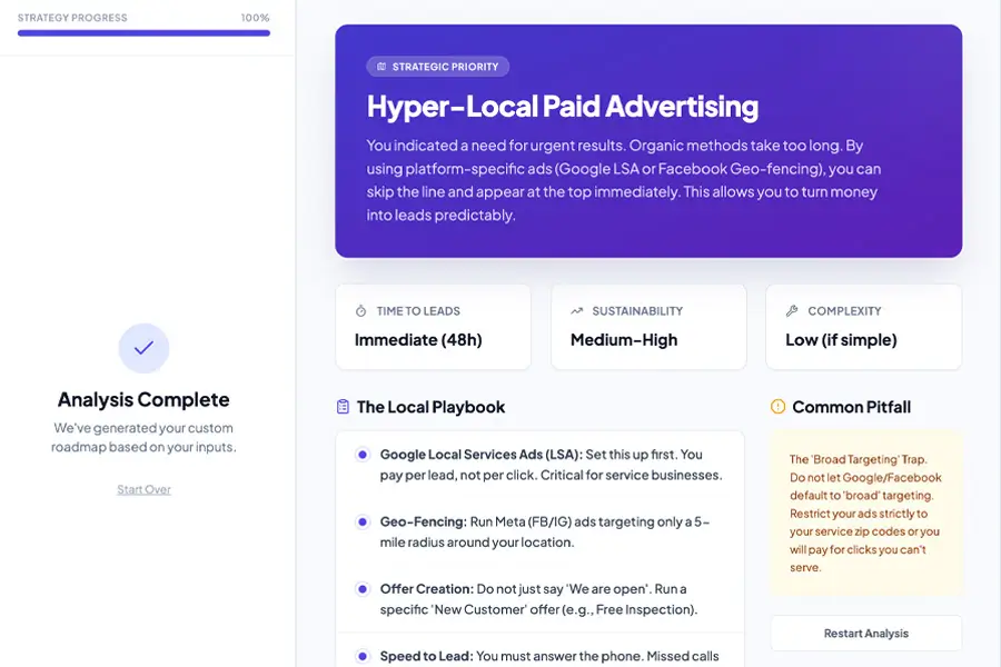 Answer a few questions and get guidance on where your ad budget should go. Helps avoid wasted spend and focus on platforms that fit your business type.