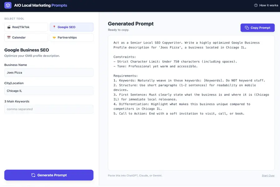Build structured prompts for different marketing assets like ads, posts, and banners. Keeps your visuals consistent across platforms.